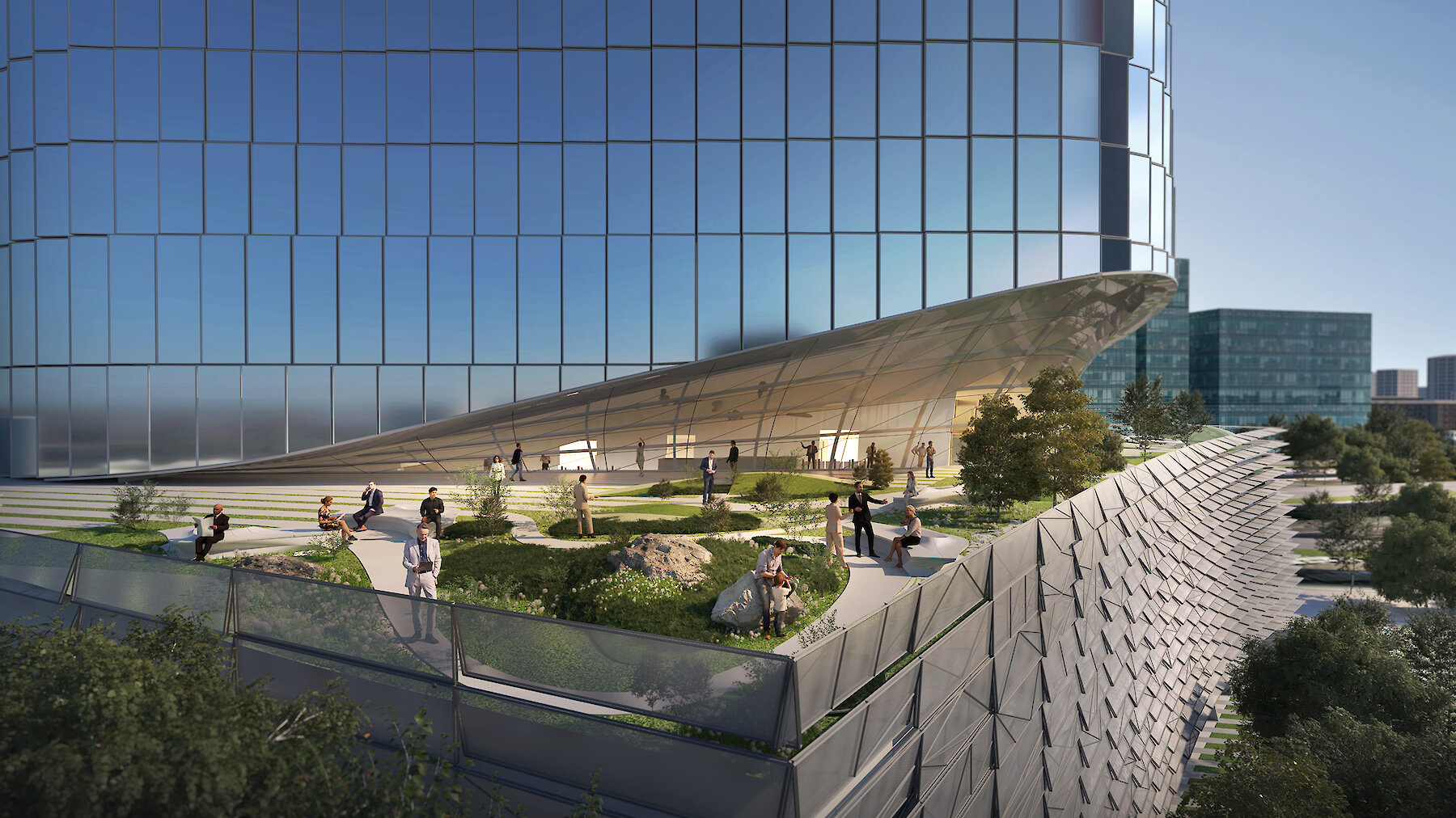 The limited distance from the core to the facade became the driving force behind the form-finding process. With the help of the tapered core, each floor plate is optimized to fit within the constraints of a minimum of 11 m and a maximum of 15 m. The tower’s office floors have a flexible layout. They include a retail zone on the ground level, which is connected to an urban plaza. There is also a common roof garden with greenery, multifunctional rooms for informal meetings and events, and a rooftop viewing platform with spectacular 360-degree views of the central city and beyond.