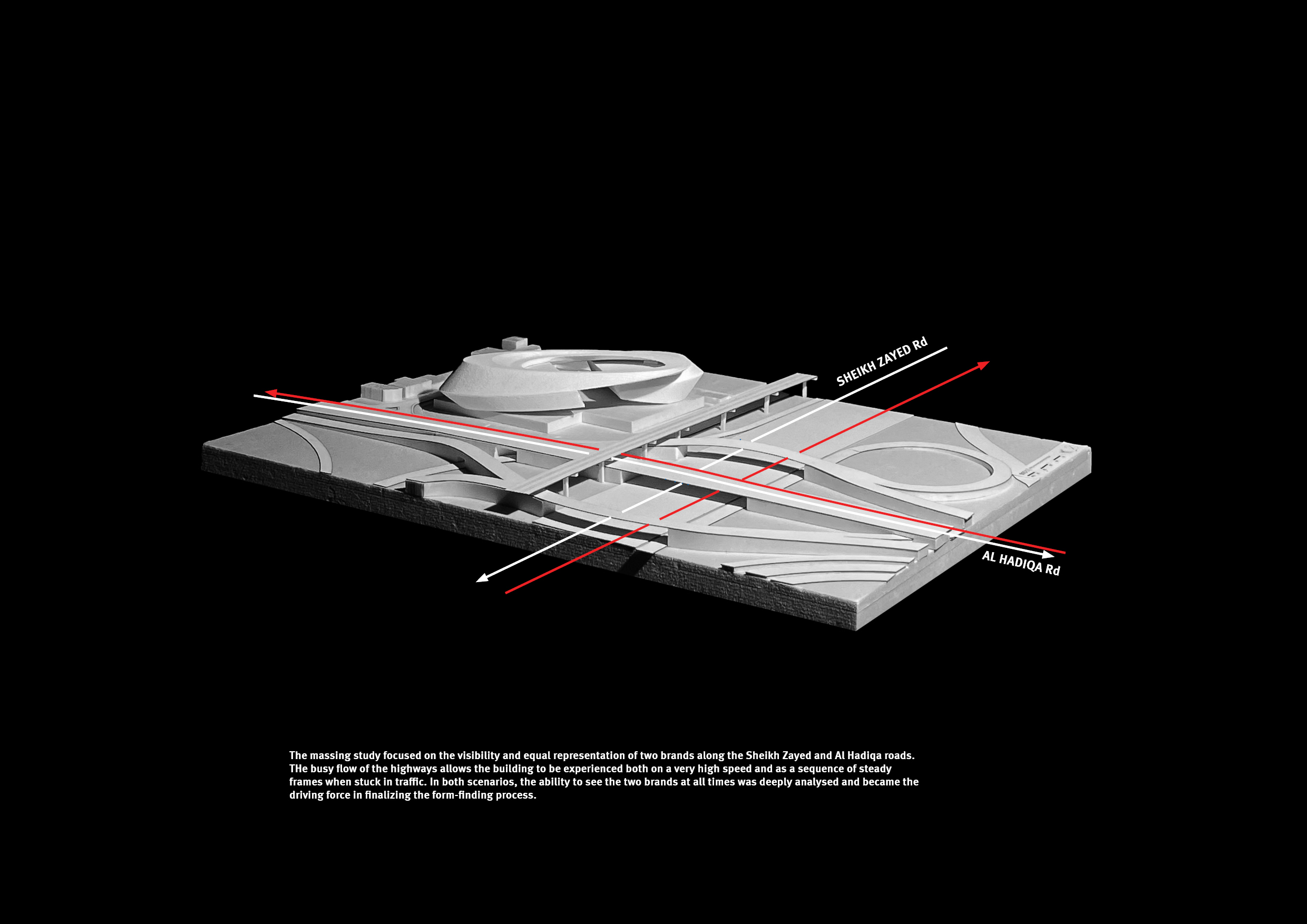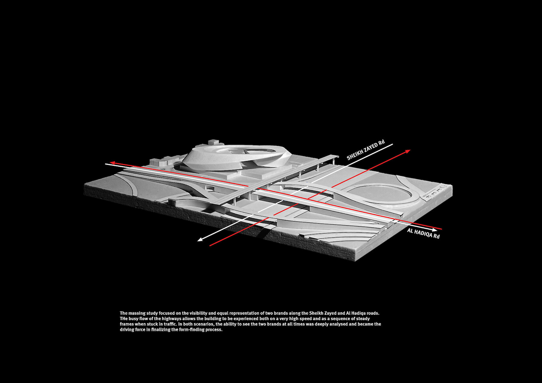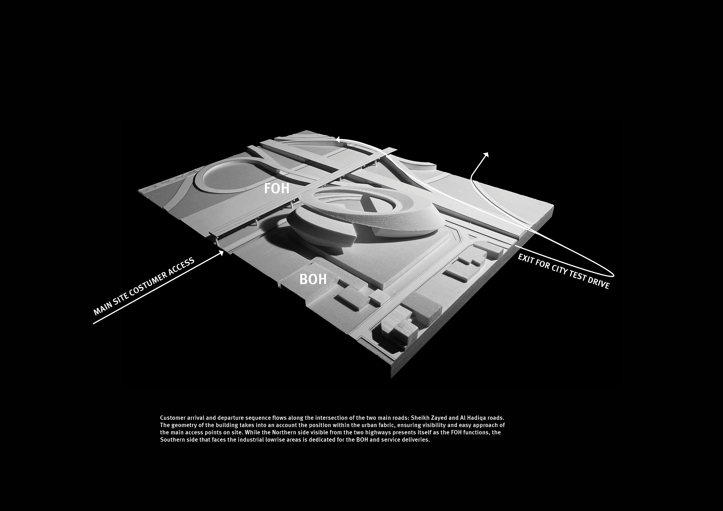 Urban Integration and Arrival Sequence Positioned for maximum visibility and prestige along Sheikh Zayed Road and Al Hadiqa Road, the facility’s geometry responds directly to its urban context. It provides intuitive access and commanding presence from all major approaches. The northern elevation presents the front-of-house functions prominently to the highways, while the southern side, facing the industrial zone, accommodates the back-of-house operations and service logistics. Cutting-edge digital technologies, dynamic lighting, and striking architectural features enhance the brand’s presence and create a cohesive arrival and departure sequence.