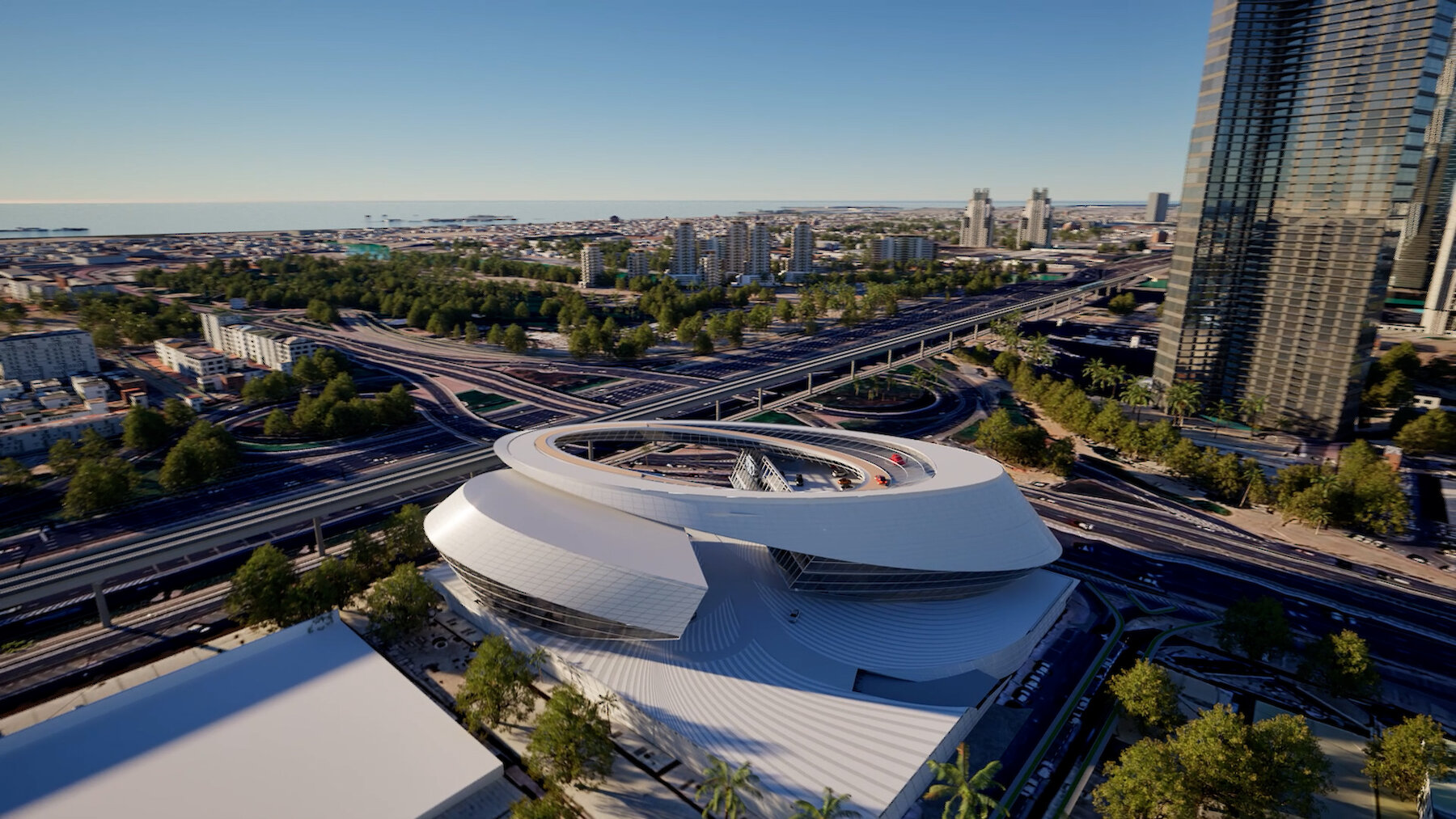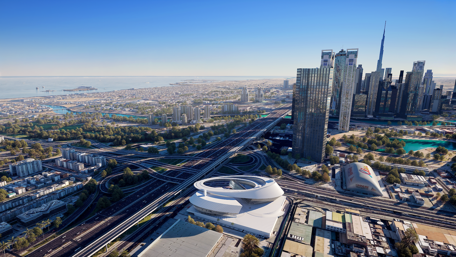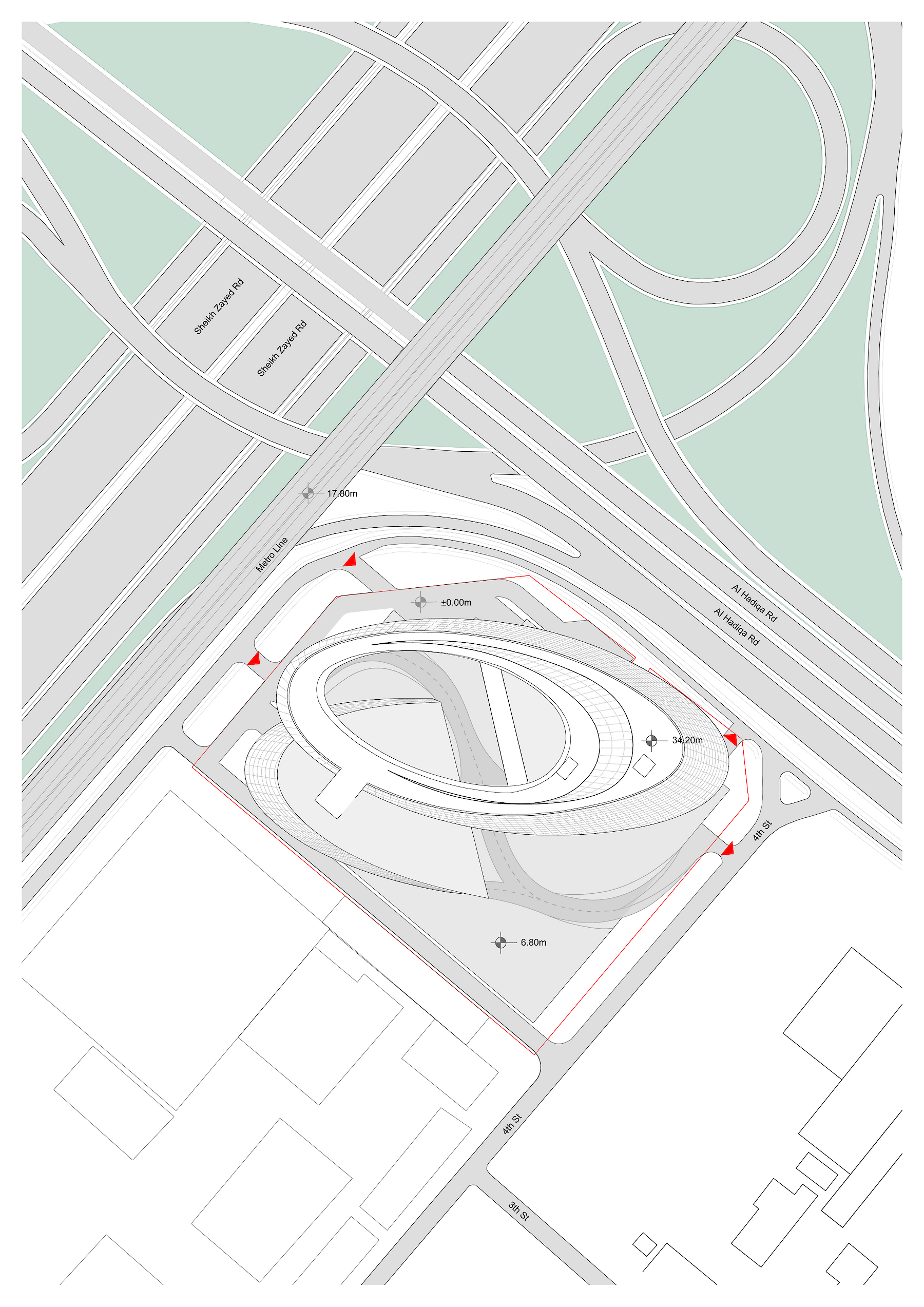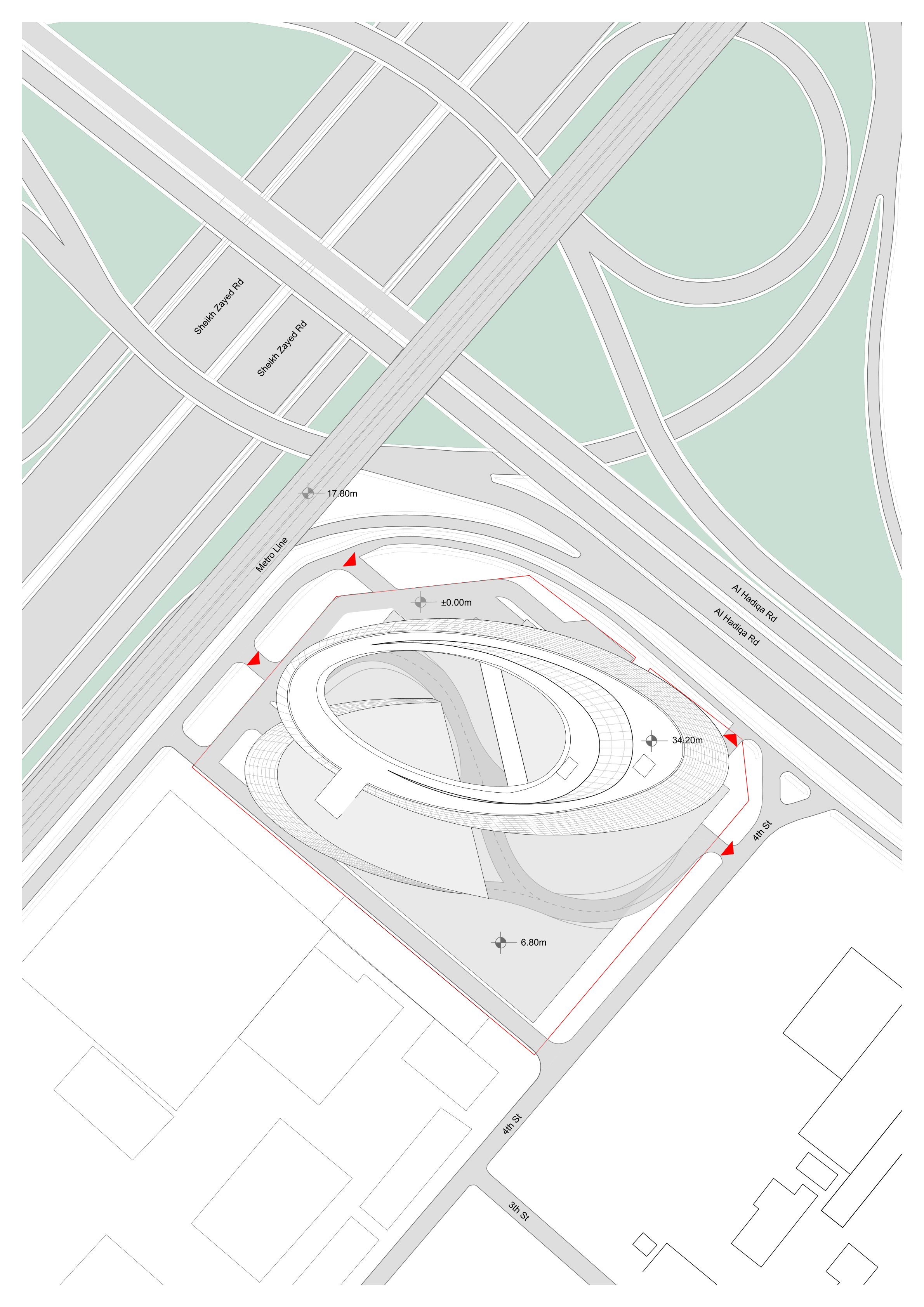 Urban Integration and Arrival Sequence Positioned for maximum visibility and prestige along Sheikh Zayed Road and Al Hadiqa Road, the facility’s geometry responds directly to its urban context. It provides intuitive access and commanding presence from all major approaches. The northern elevation presents the front-of-house functions prominently to the highways, while the southern side, facing the industrial zone, accommodates the back-of-house operations and service logistics. Cutting-edge digital technologies, dynamic lighting, and striking architectural features enhance the brand’s presence and create a cohesive arrival and departure sequence.