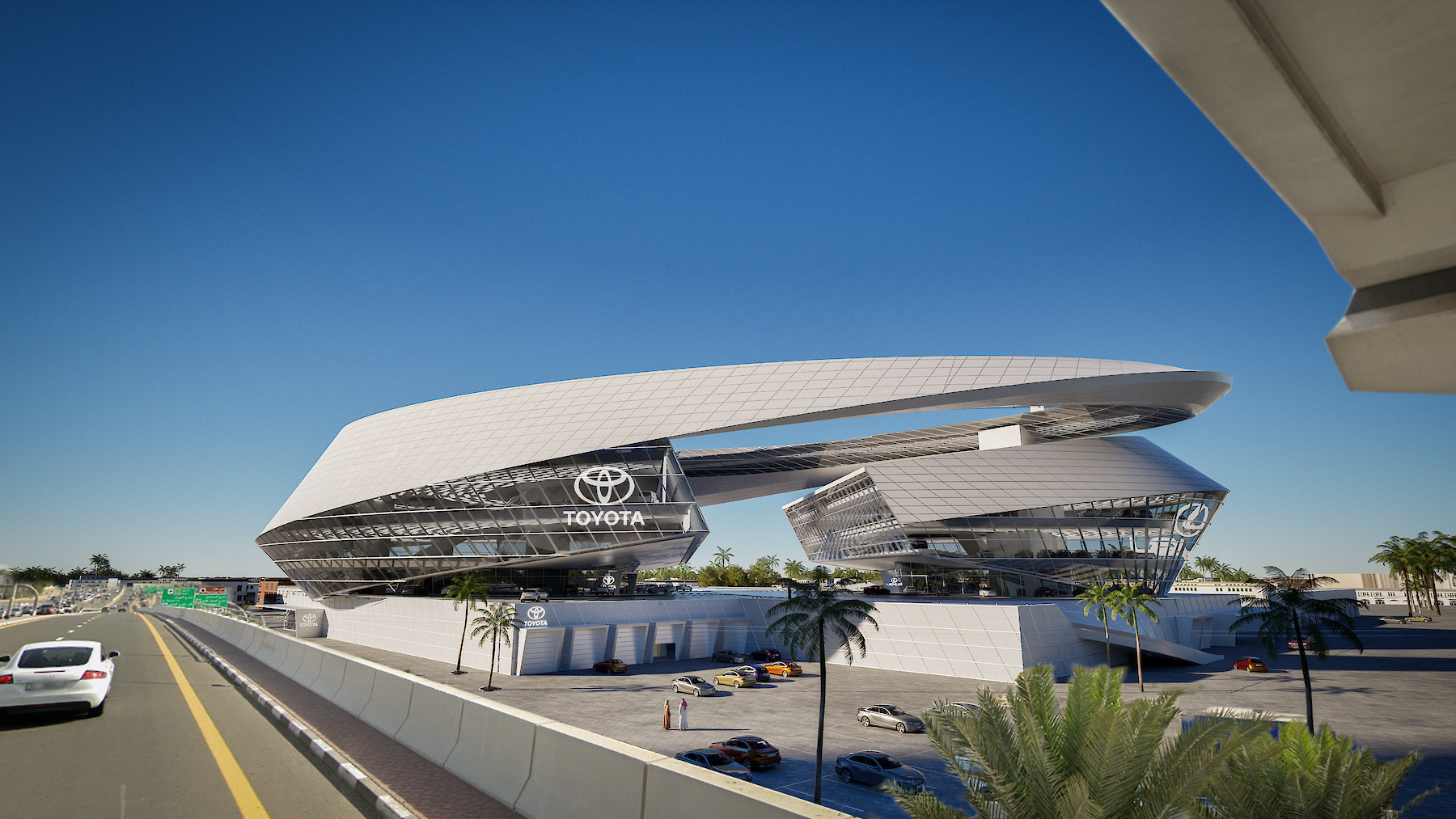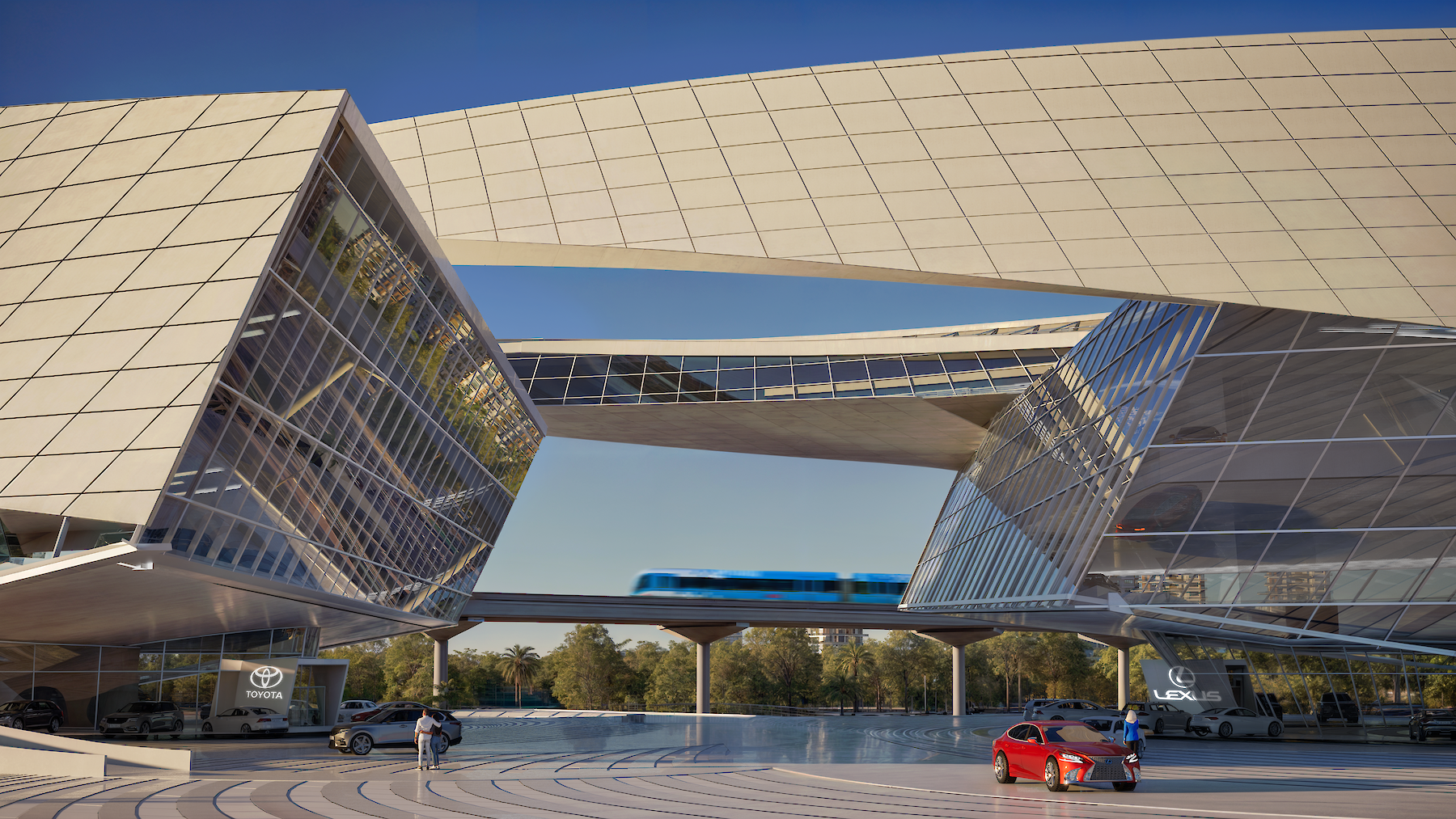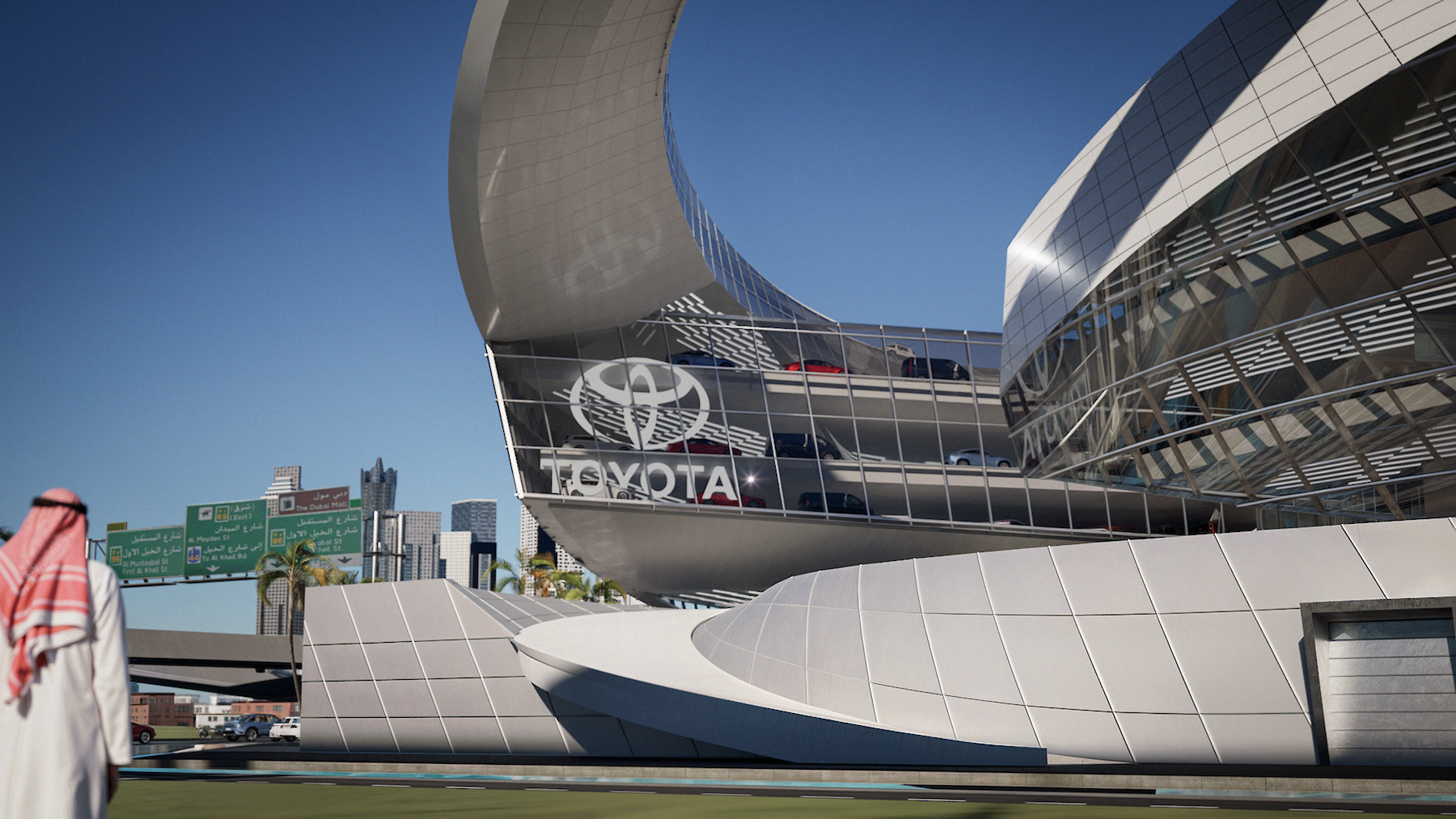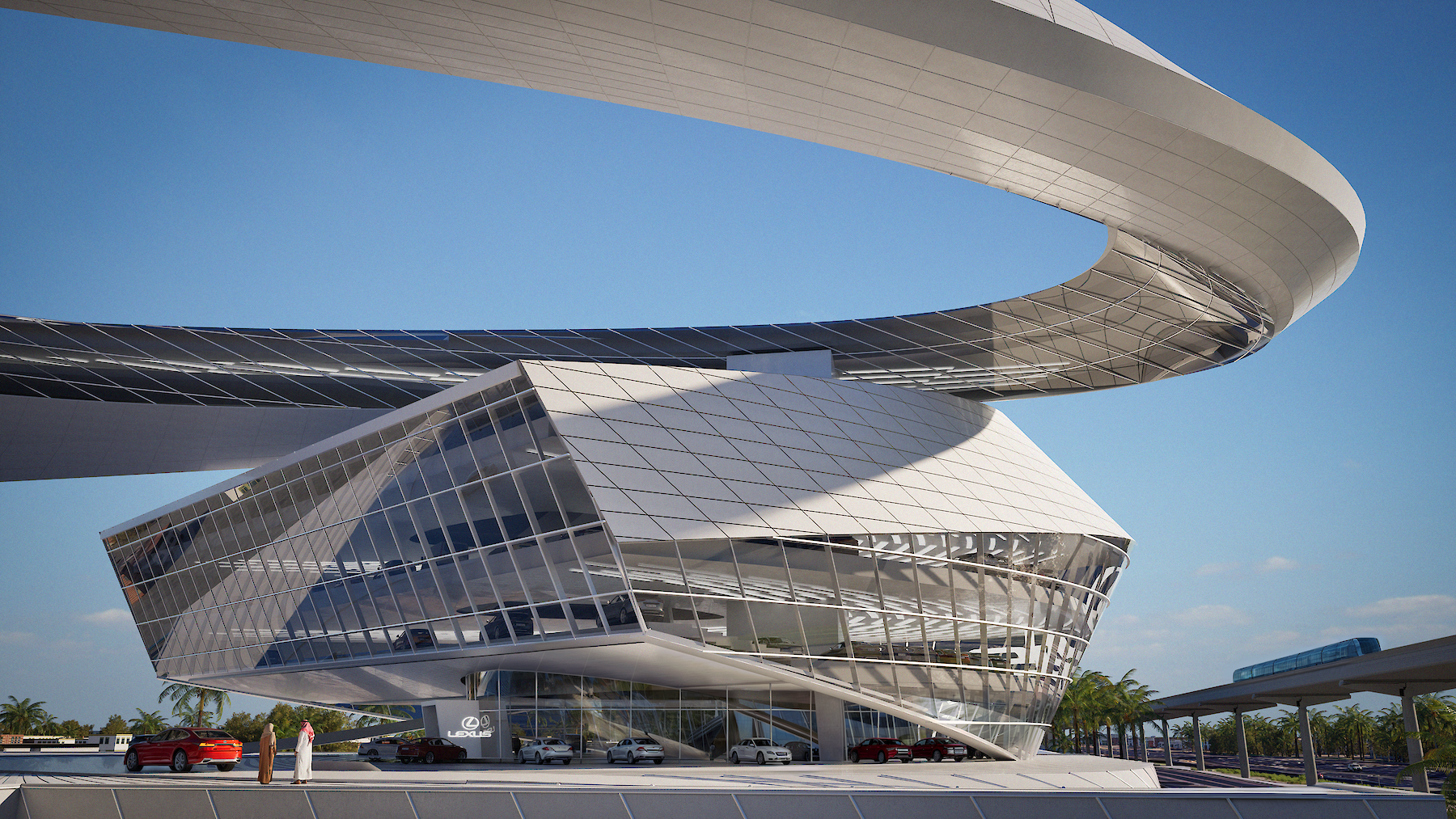 The building’s shape is carefully designed to provide equal and continuous visibility of both Toyota and Lexus from all surrounding roads. This visibility is maintained whether the building is viewed at high speeds on the highway or in slower, frame-by-frame sequences in traffic. The design accounts for the shifting vantage points created by the elevated metro line to ensure the building maintains a strong identity from afar and close up. This approach reinforces the iconic character of the development and establishes Al-Futtaim’s flagship as the region’s premier, cutting-edge automotive destination.