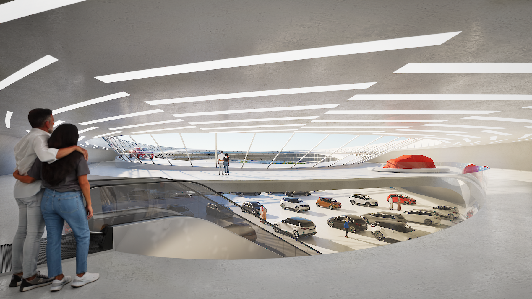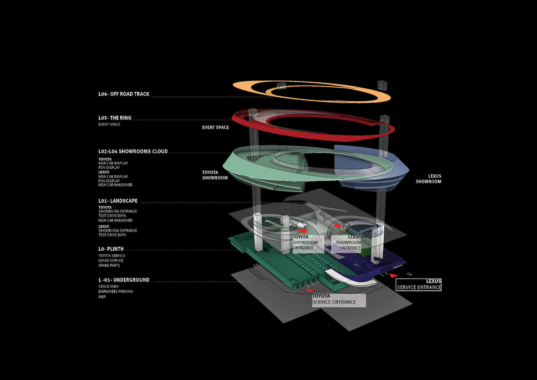 The Showroom Cloud design places the Lexus and Toyota showrooms on top of a service plinth. Customers arriving by car can drive up a dedicated ramp that leads directly to shaded, premium entrance zones. Organized across three levels, the showrooms display the latest products, technologies, and services. The showrooms are connected by a fully climate-controlled bridge accessible from the third level. This bridge is ideal for customers who wish to visit both showrooms in one continuous journey.
