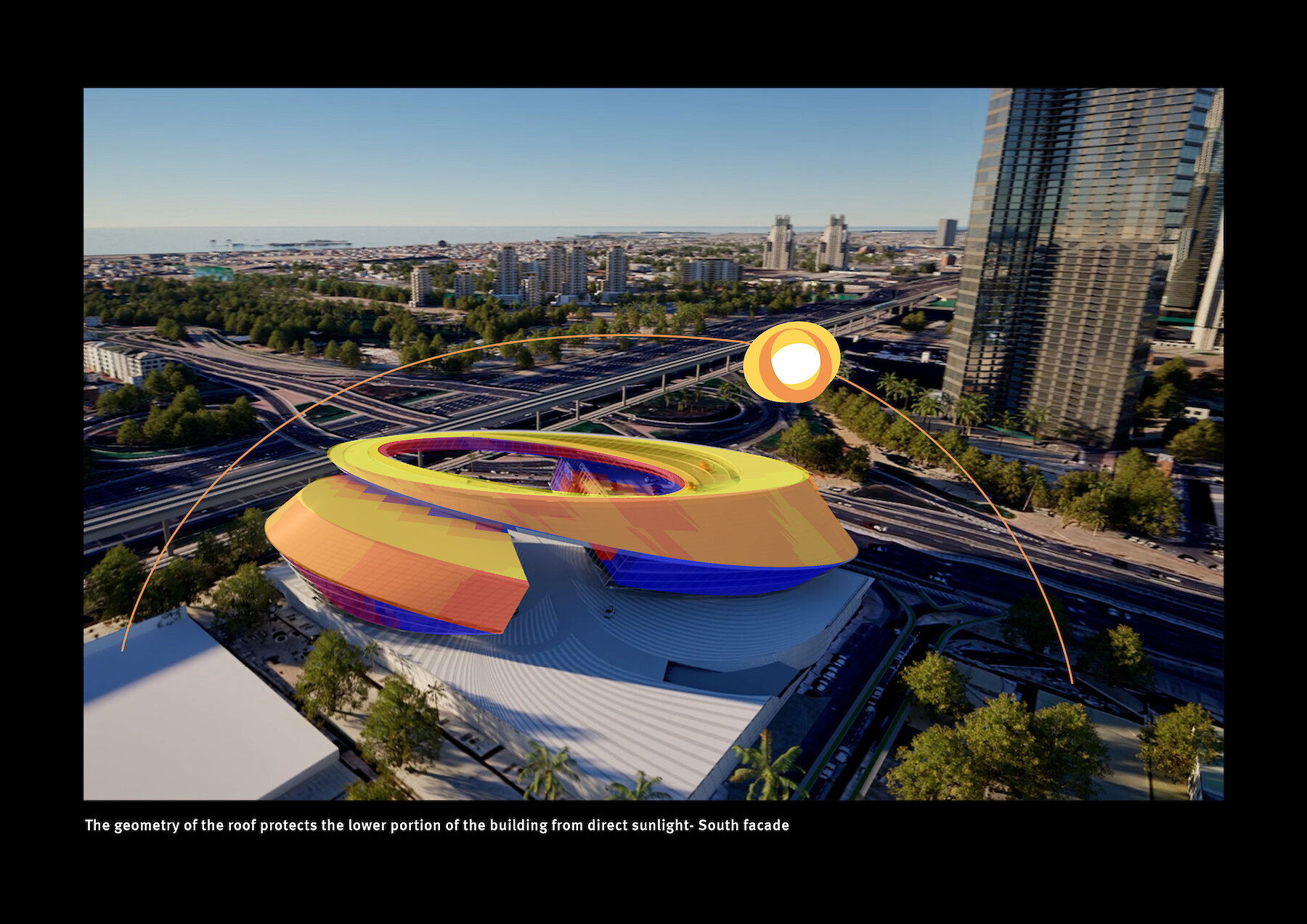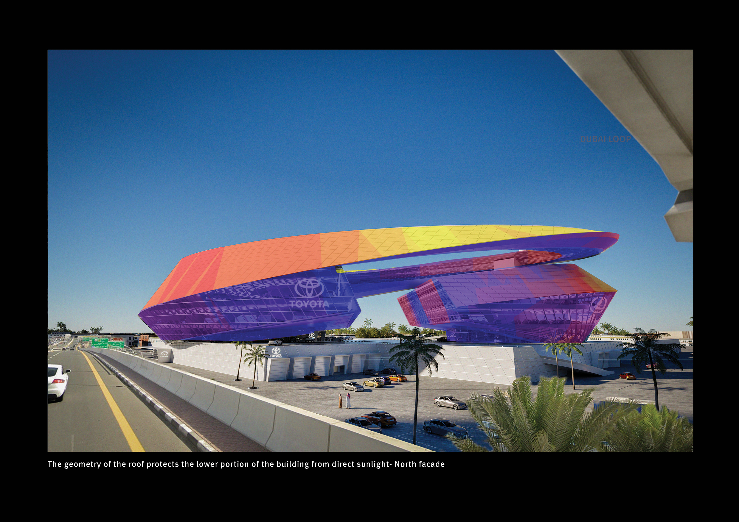 A key design challenge is balancing the need for a transparent facade that showcases the primary functions with the demanding climate of the region, which significantly impacts the comfort and energy performance of glazed buildings. This challenge is addressed with an architectural crease that naturally shades the lower half of the facade, creating optimal conditions for the main product display area. The upper portion is designed as an opaque envelope to mitigate solar heat gain and provides extensive surface area for photovoltaic panels. This supports the building’s cooling-related electricity demand and enhances it overall sustainability.