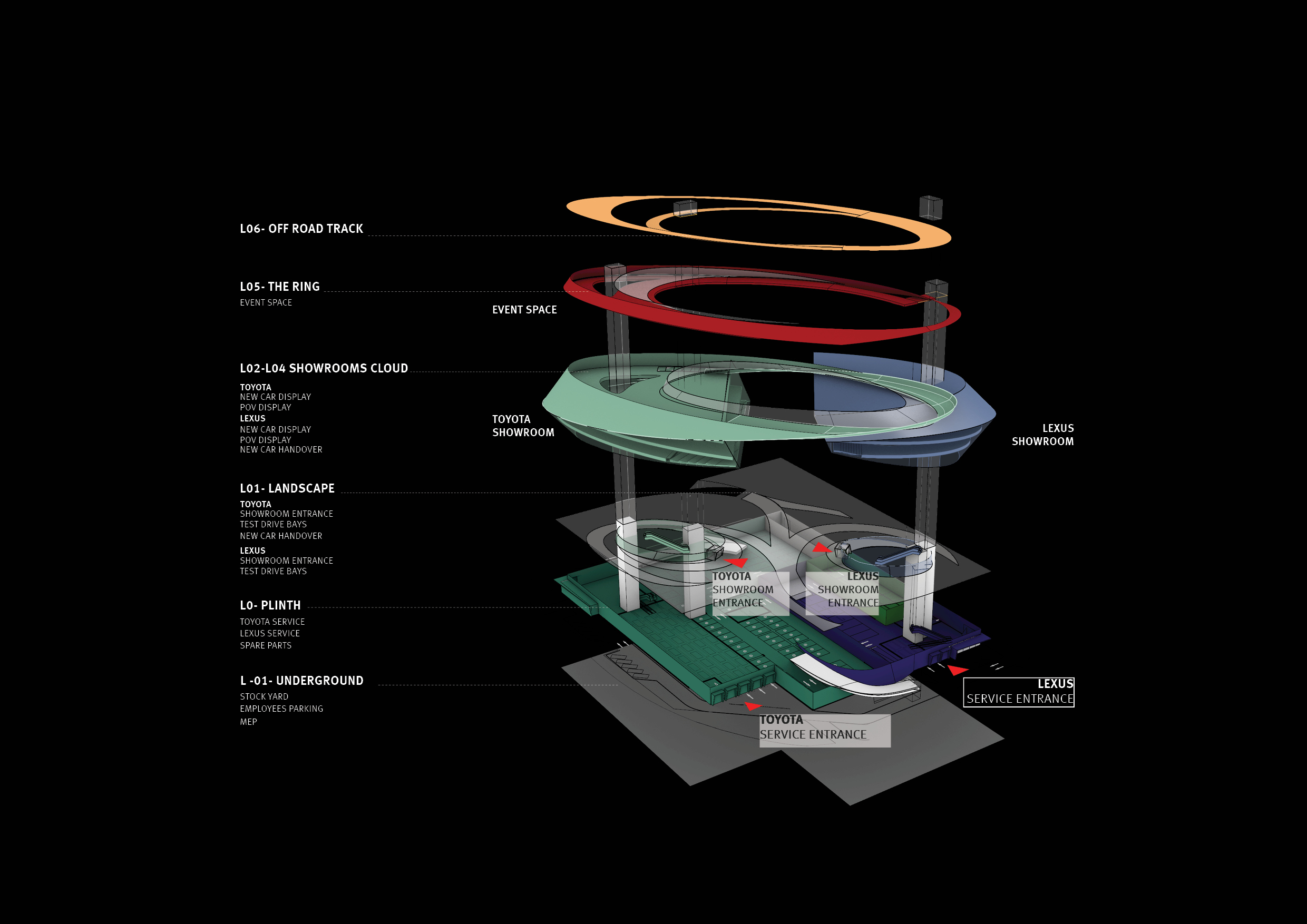 the Service Plinth and the Loop Off-Road Ring. These components are interconnected through dedicated vertical circulation systems for both clients and vehicles.