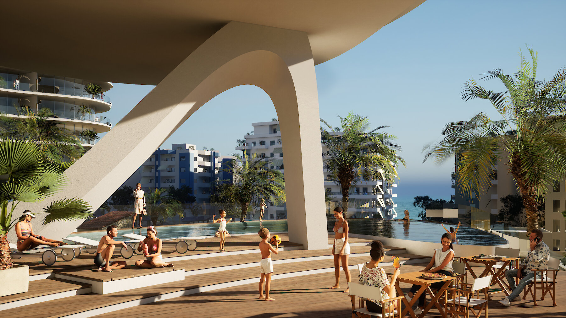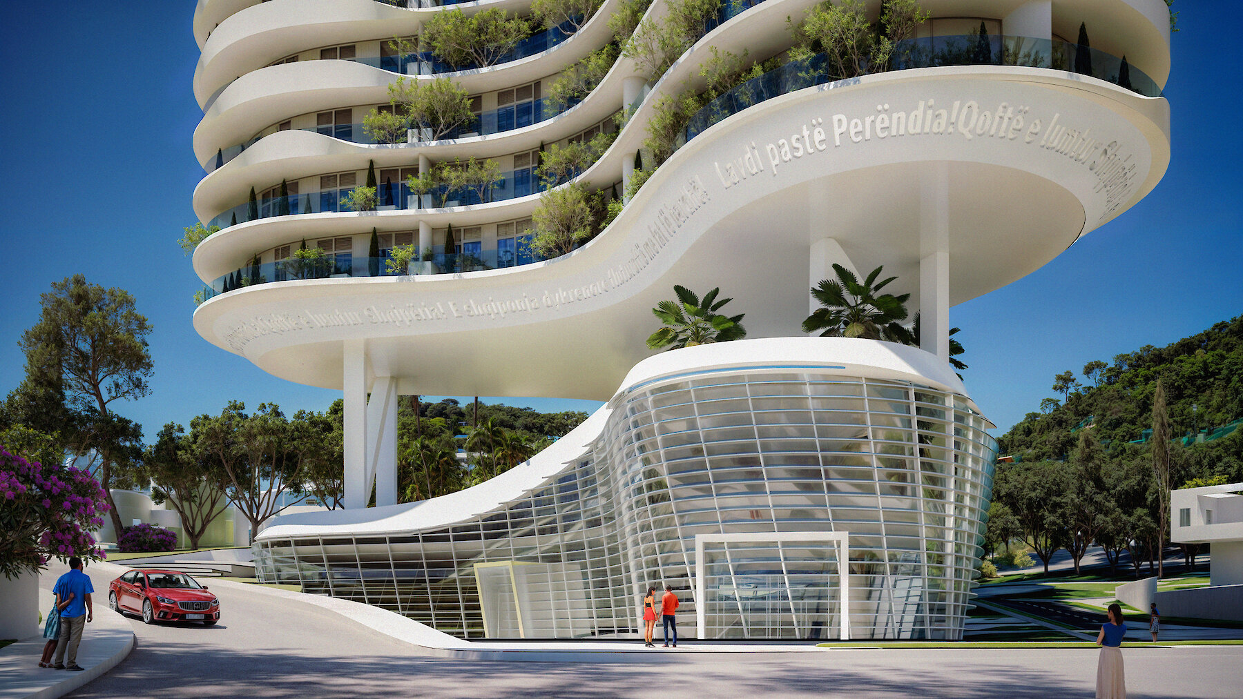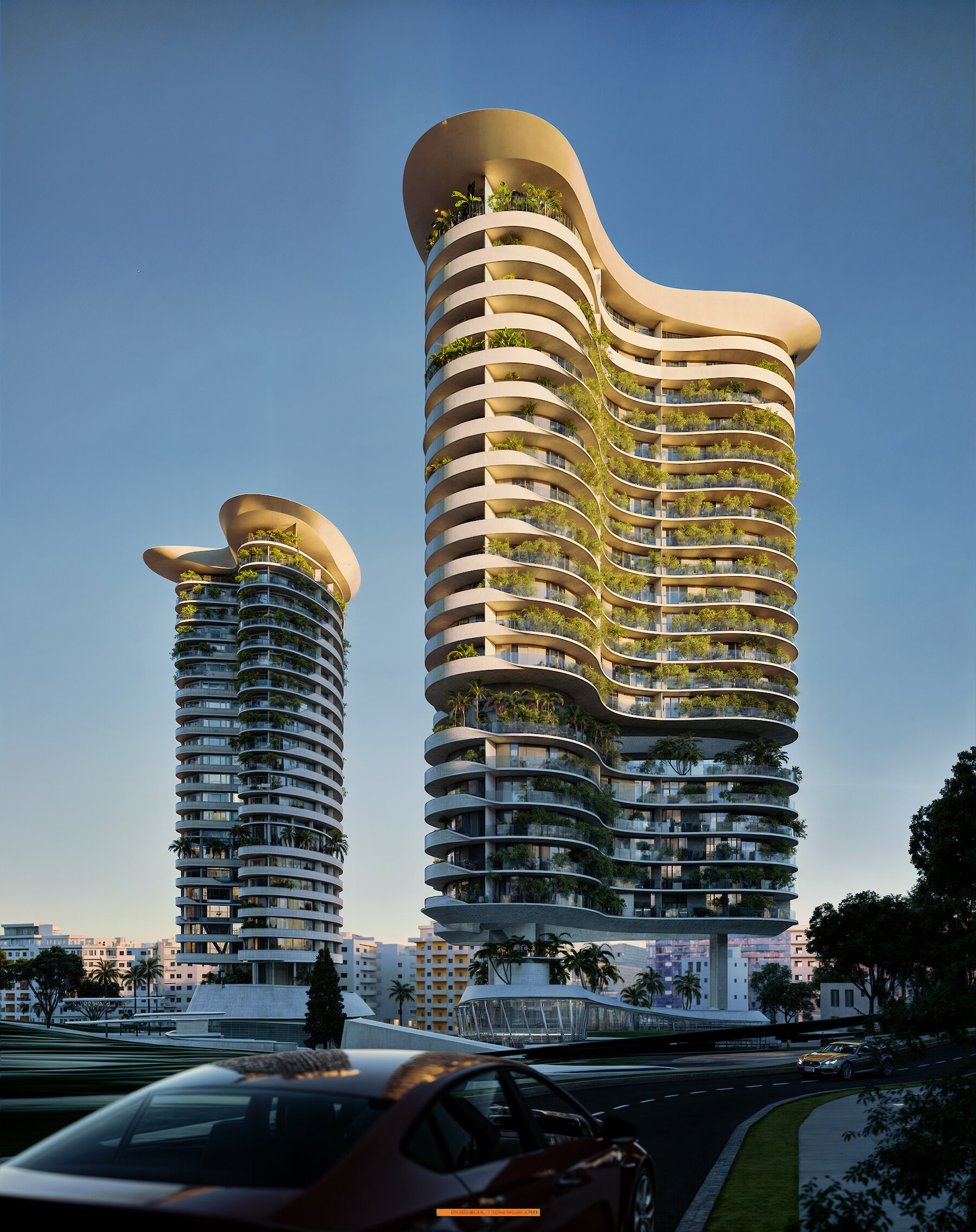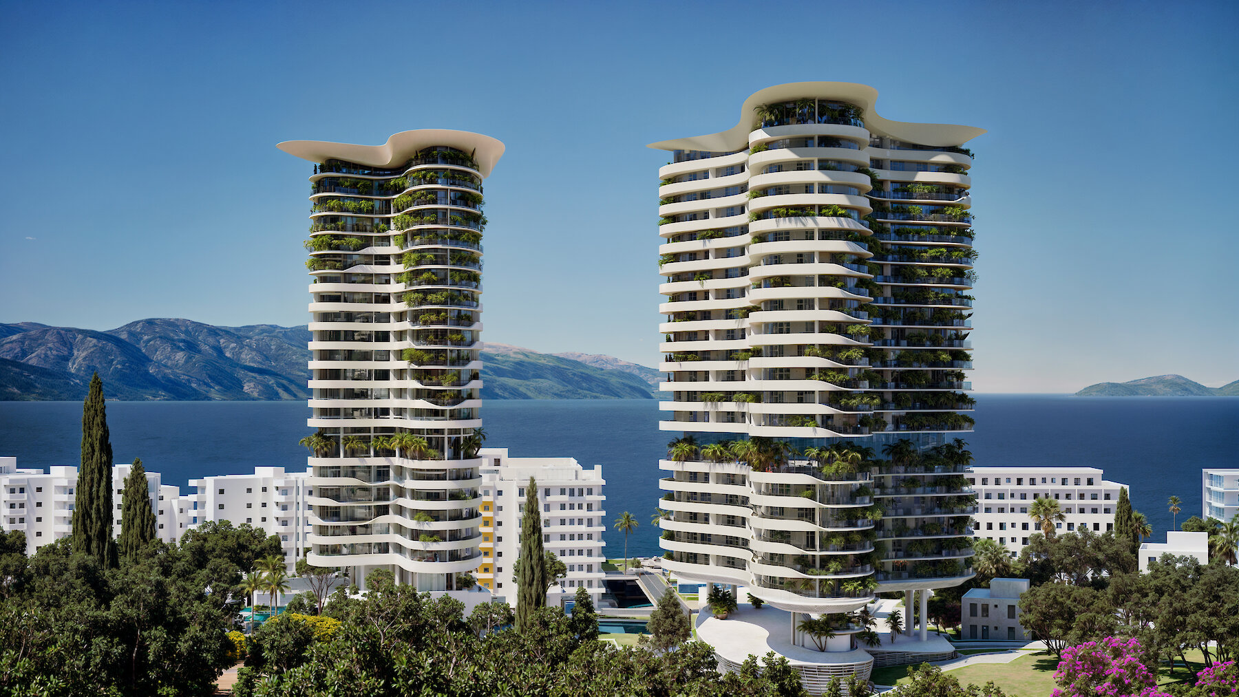 Both towers are conceived as fluid, organic forms — resembling amoeba-like silhouettes — elegantly rising above a solid, monolithic plinth. Positioned on the second row of buildings from the waterfront, their elevated design maximizes sea and mountain views for both residents of the Luzaj Tower and guests of the hotel.